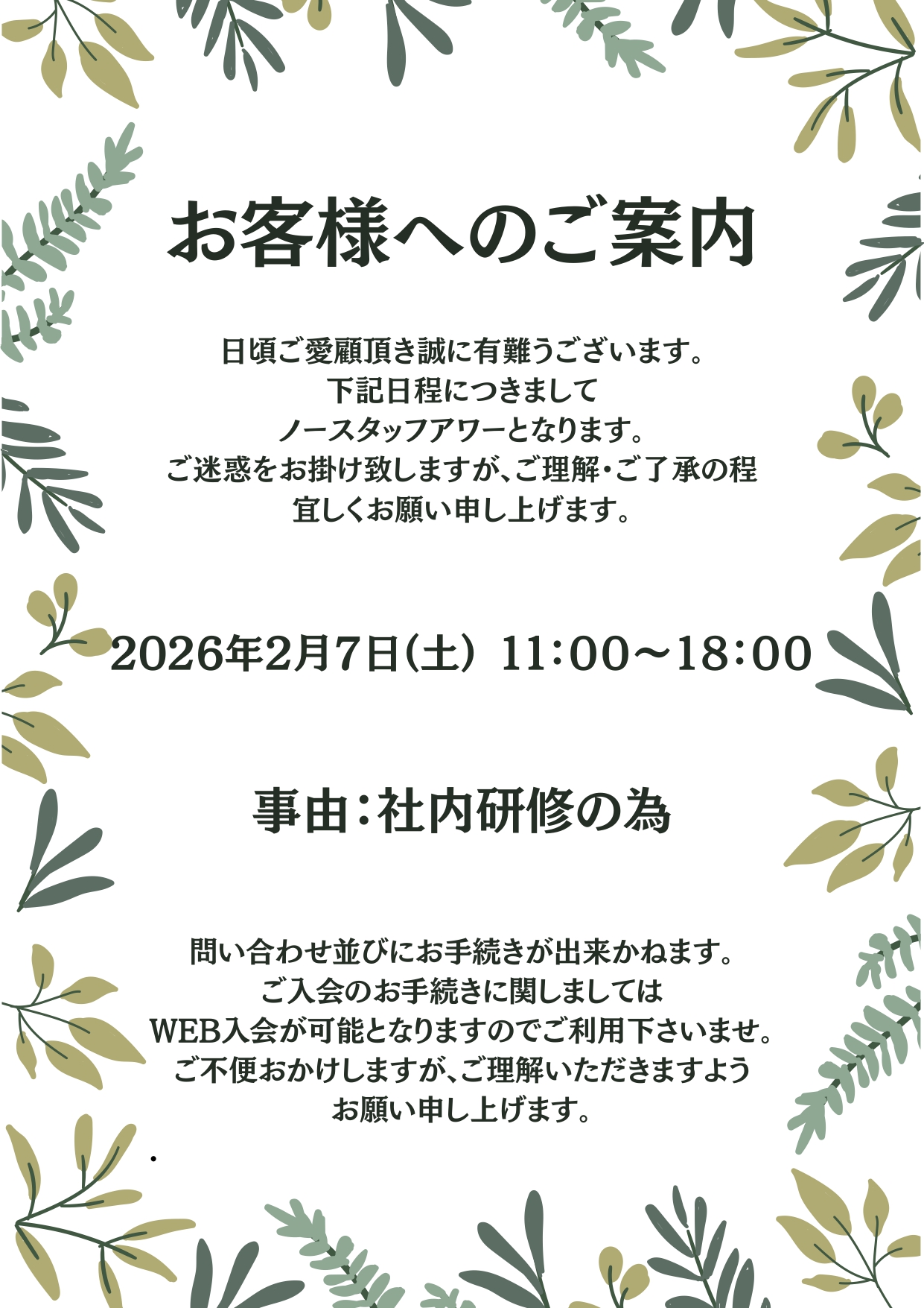2月7日(土)社内研修の実施により終日ノースタッフとなります。