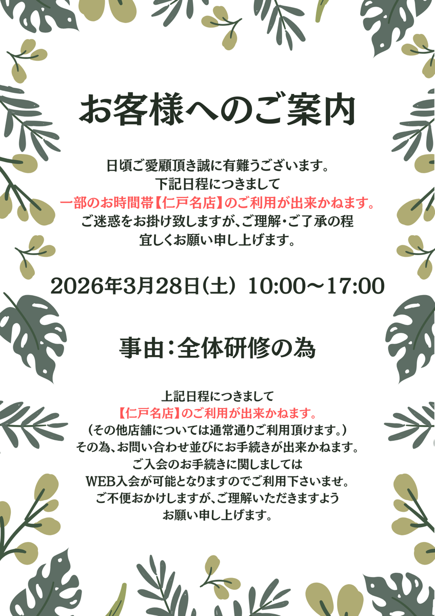 下記日程につきまして、全社研修実施のため一部のお時間帯【QUICK GYM仁戸名店】のご利用ができかねます。